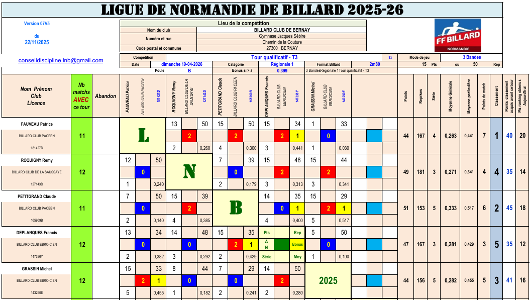 3 Bandes R1 tour 3 poule B du 19 avril à Bernay